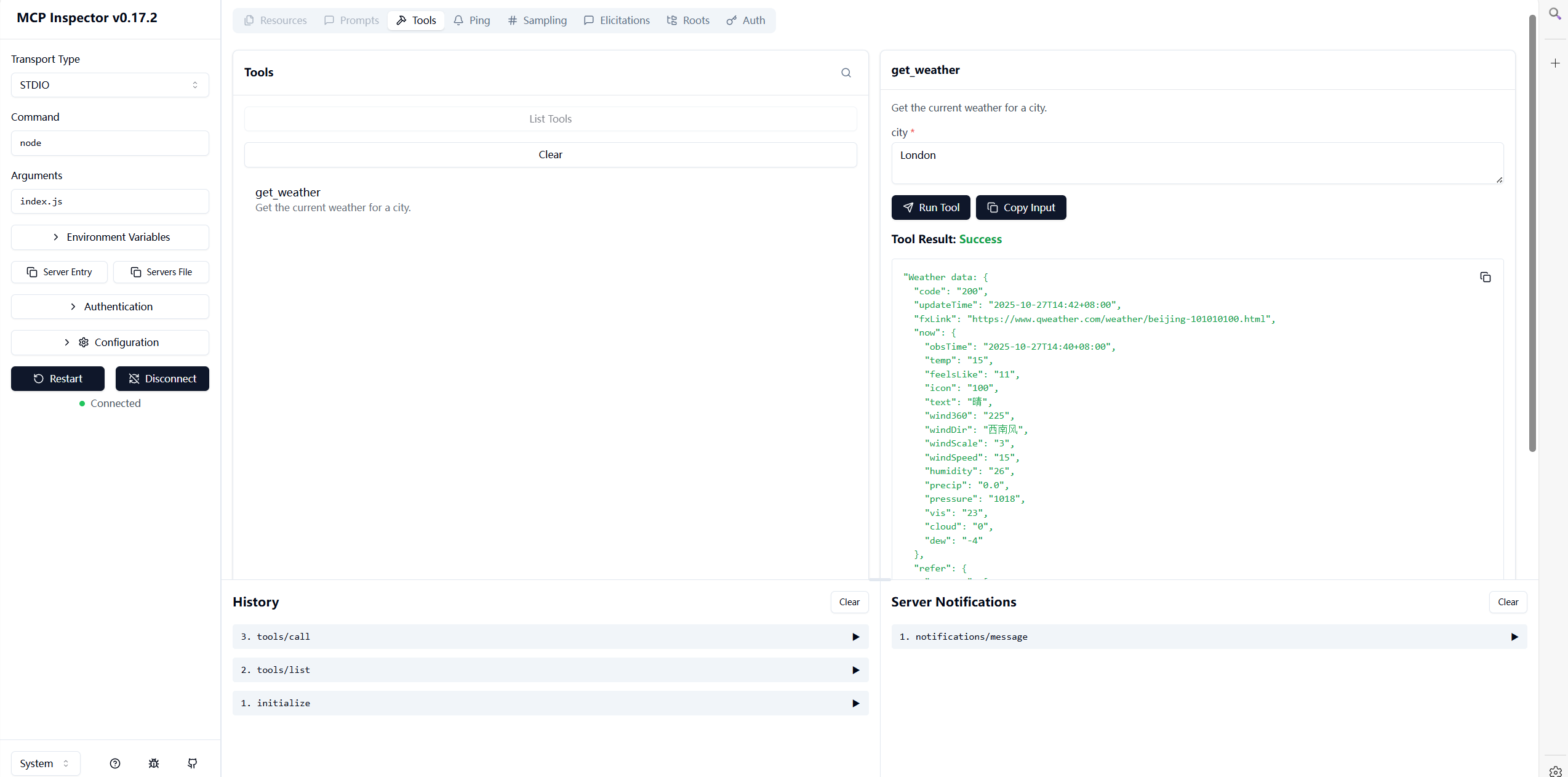 npx @modelcontextprotocol/inspector node index.js即可进入测试页面,前提需要安装inspector